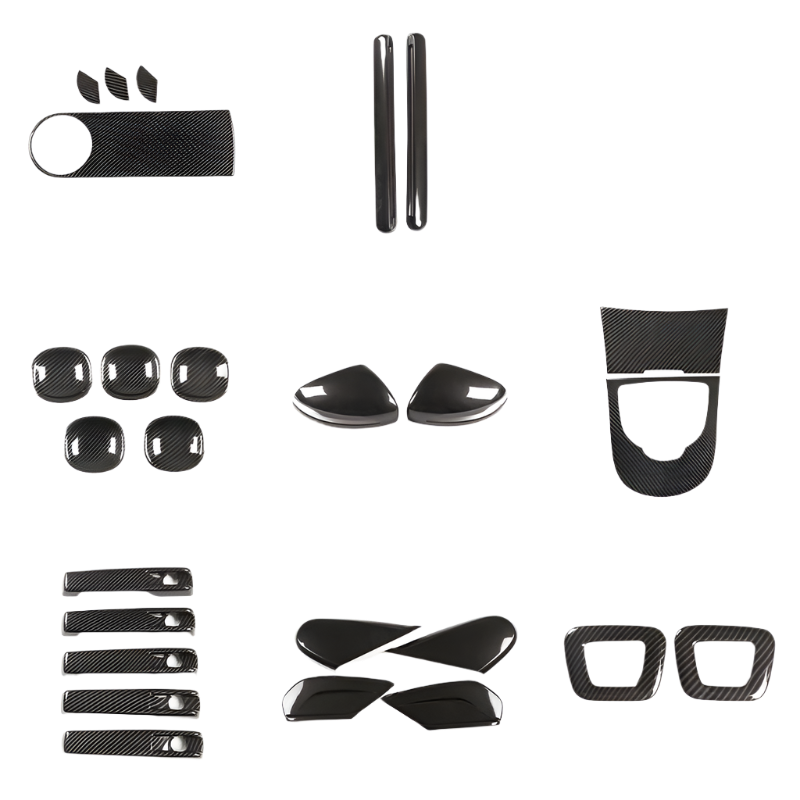 Exterior ABS Carbon Cover Window Surround ABS Carbon Central Dash Surround ABS Carbon Seat belt cover ABS Carbon Air vent A Pillar ABS Carbon Side Vents ABS Carbon 11 Exterior mirror ABS Carbon Exterial Side Strip ABS Carbon Vent ABS Carbon 17 Bumper moulding ABS Carbon rear wheel insert ABS Carbon Door Bowls ABS Carbon 14 1 13 18